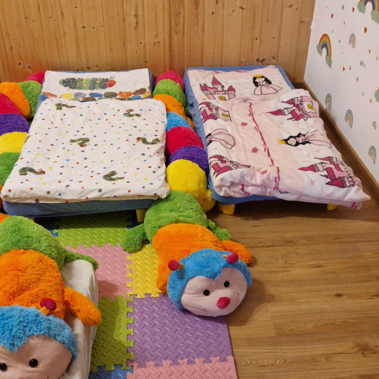 Für den Mittagsschlaf oder um sich auszuruhen gibt es den Schlafbereich mit einem eigenen bodennahen Bettchen für jedes Kind.